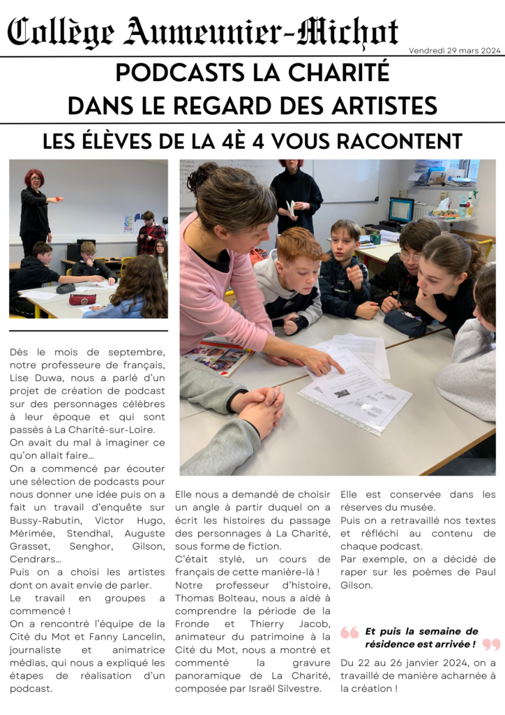 La classe de 4ème4 du collège Aumeunier-Michot à La Charité sur Loire, avec Elyes Alfier, Sara Boukhabza, Nolan Branquinho, Ryan Calvi, Noah Chaillou, Axel Clarisse, Luca Deal-Thienne, Lucas Deligny, Lilou Durlin, Evan Ferreira-Mirandela, Nathan Fineau, Hugo Gadéa, Safa Gazani, Enzo Hervé-Poirier, Julia Jardin, Manon Laborde, Samuel Lallemand, Clément Loyau, Enzo Muller, Manon Mureau, Driss Parriaux, Romane Perraud, Keliah Quenault-Bazot, Nathan Saget, Lola Skrzypniak-Colomer, Séréna Tat, Téa Trotot, Louanne Yvon.