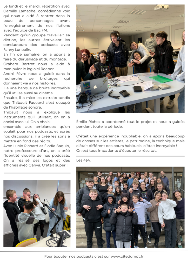 Retrouvez ce nouvel épisode réalisé et enregistré en avril 2025 par les élèves de 3ème2 du collège Aumeunier Michot. La réalisation de ce podcast est la poursuite du travail mené ci-dessus sur l’année scolaire 2023-2024 avec ces mêmes élèves.