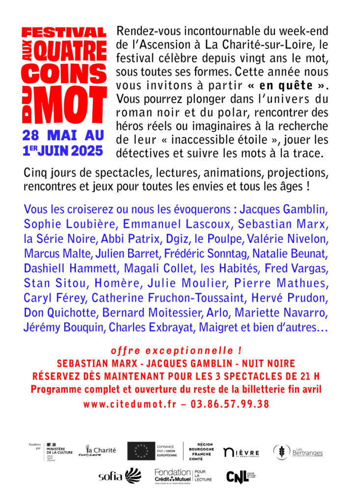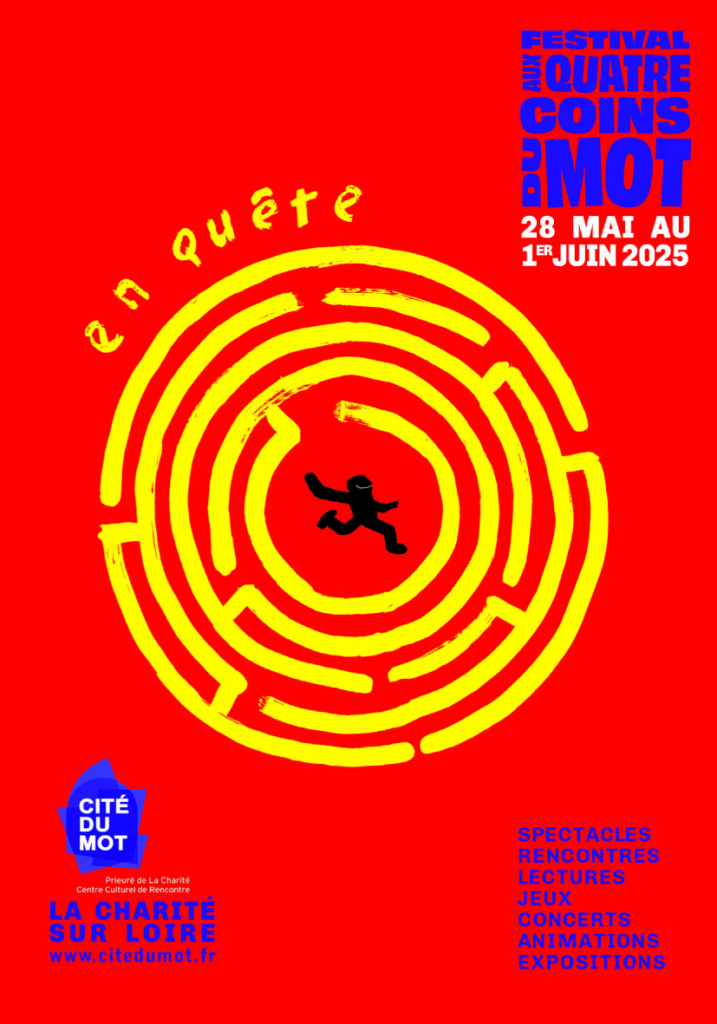 AUX QUATRE COINS DU MOT c’est d’abord l’ambition de créer une manifestation unique à La Charité-sur-Loire. Elle y puisera son énergie, son originalité, ses récits et aussi son goût du partage, de la discussion et sa tradition d’accueil et de tolérance. AUX QUATRE COINS DU MOT multiplie à travers la ville les opportunités de rencontre, d’échange et de convivialité où artistes, festivaliers, organisateurs, et charitois pourront se croiser.