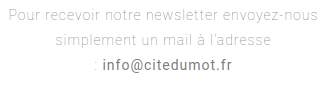 Votre adresse e-mail est uniquement utilisée pour vous envoyer notre newsletter et des informations sur les activités de la Cité du Mot. Vous pouvez toujours utiliser le lien de désinscription inclus dans la newsletter.